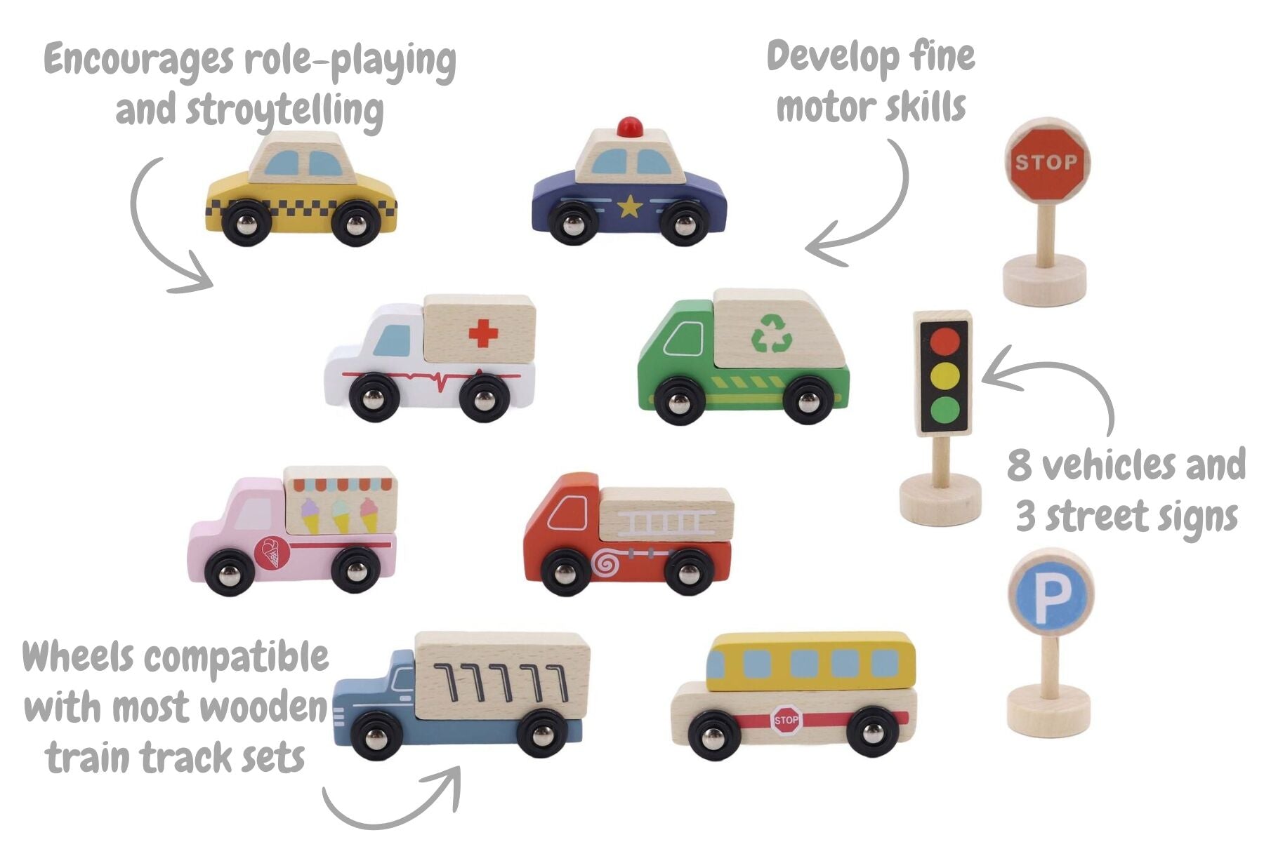 Delve into the enchanting realm of wooden toys with the Tooky Toys Wooden Cars Set. This exquisite collection features eight intricately designed cars and three road signs, meticulously crafted to inspire imaginative play and creativity. Presented in a finely crafted Wooden Display Box, each car and sign is adorned with beautiful colors and showcases Tooky Toys' dedication to quality and craftsmanship.