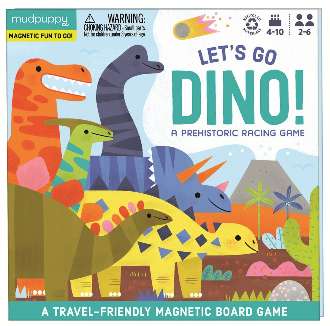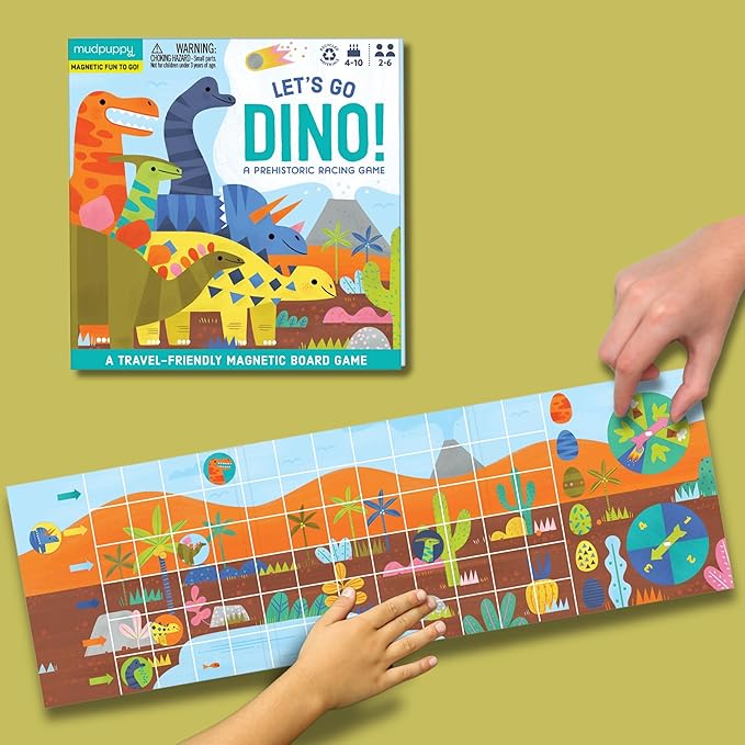 An exciting racing game for 2-6 players that includes comet crashes, (back to the start) and dinosaur battles to see who advances! The Let's Go Dino! Magnetic Board Game from Mudpuppy is a 3-panel fold-out magnetic game board making it perfect for travel or at home.