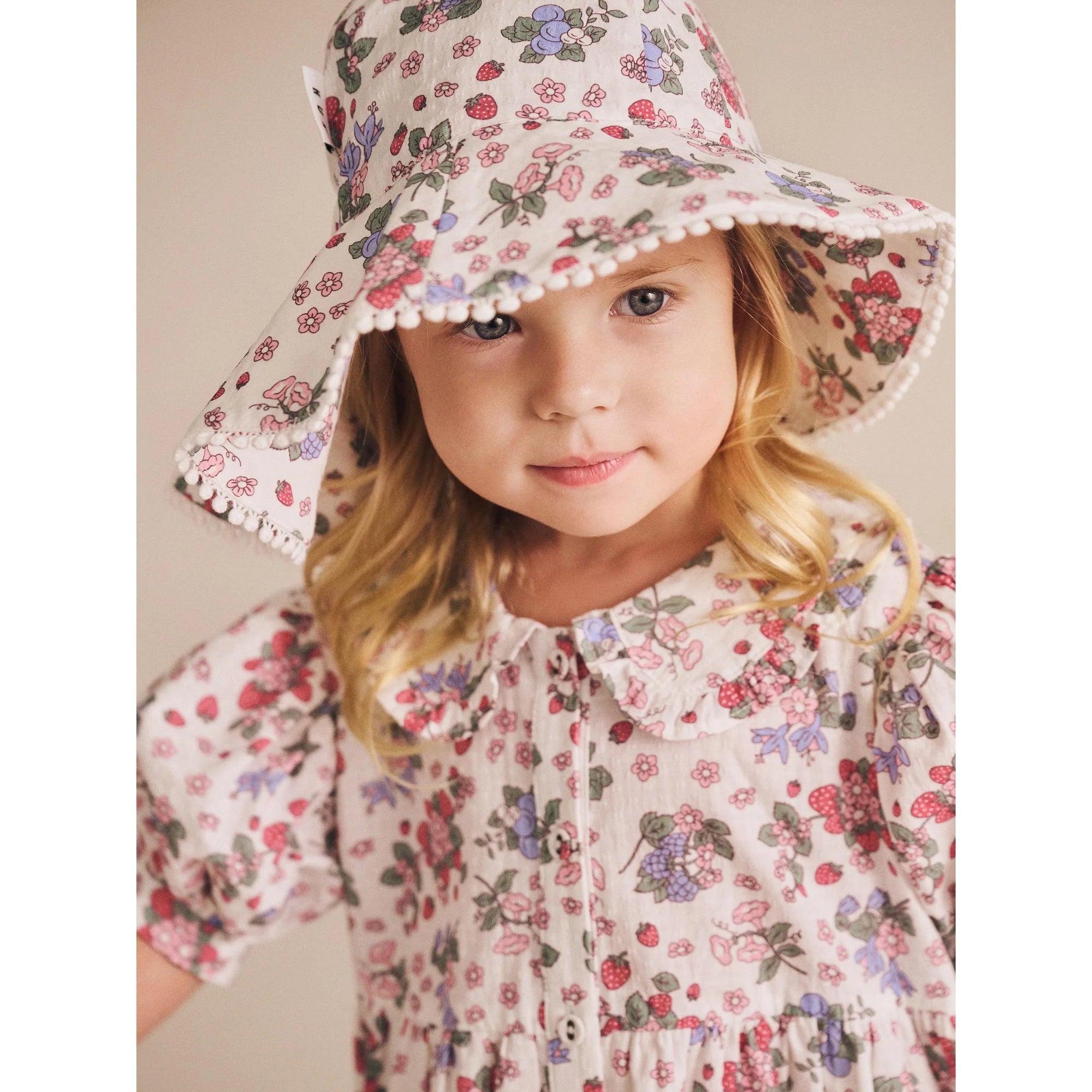 A swim hat they'll actually want to wear. This wide brim frilly sun hat is practical and pretty. Made from UPF50+ recycled polyester, it features a sweet strawberry garden pattern. Adjustable chin strap to prevent from flying away. Pair it with a matching strawberry garden swimsuit!
