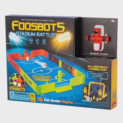 Each Foosbot has a unique design and magnetic feet that stick to the stadium floor. Simply squeeze their arms to make them spin and kick the ball with lightning speed! The stadium's raised walls keep the action contained, so you can focus on scoring goals and outplaying your opponent. It's a great way to improve hand-eye coordination and fast reflexes.