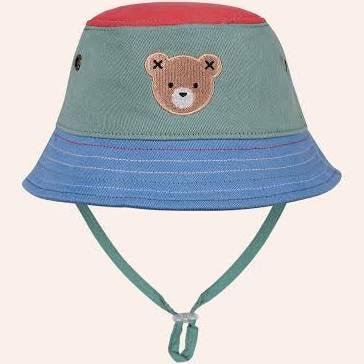 A hat they’ll actually want to wear. This dreamy colour block denim bucket hat features a Huxbear embroidery and adjustable chin strap. Fun coloured stitching detail along brim.