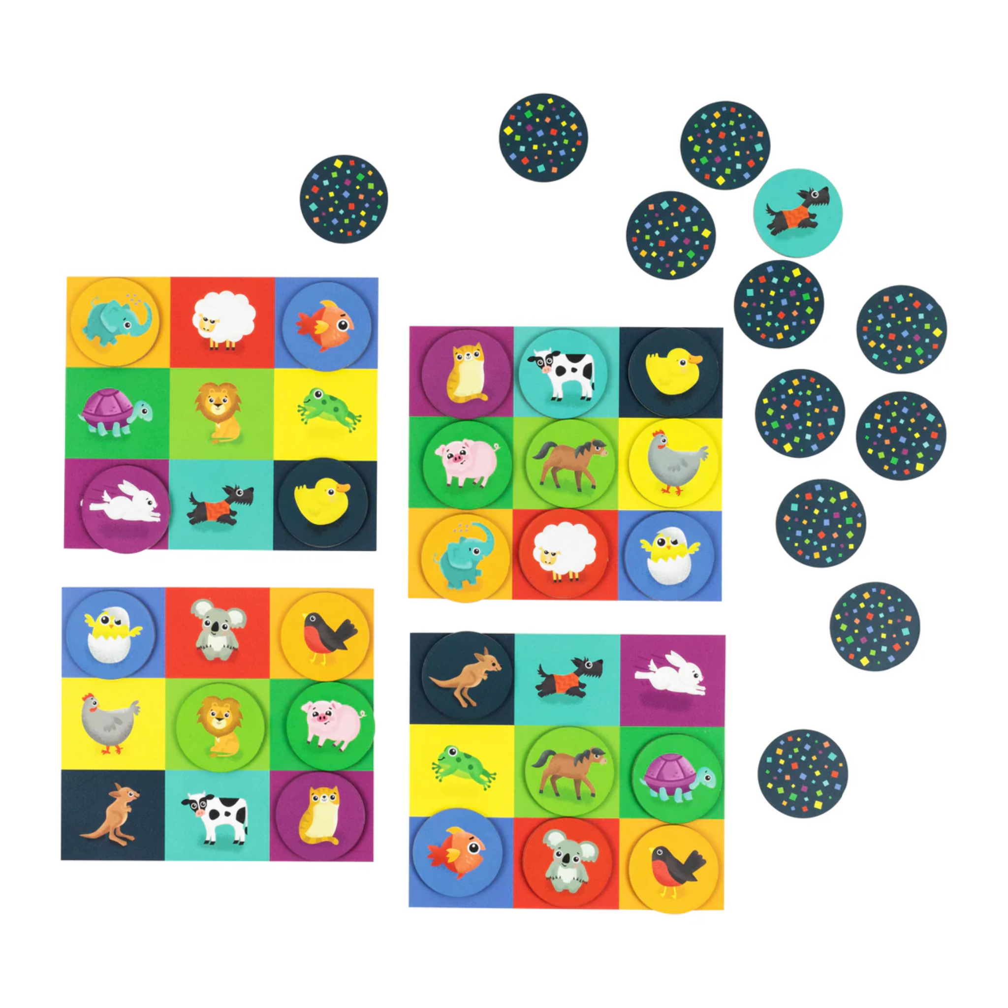 - Includes 36 animal playing tokens (featuring 18 animal pairs), 4x bingo card games, and game instructions