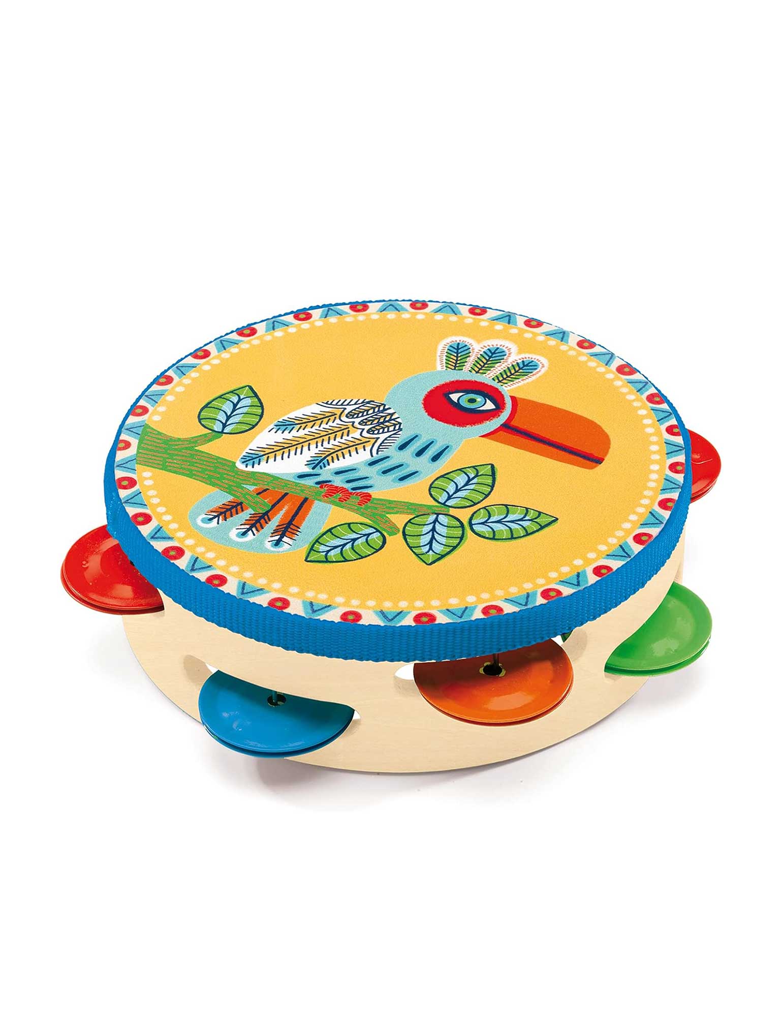 Make music with this multi-coloured Animambo tambourine. Featuring a wooden base with a beautifully detailed bird design, this tambourine makes a great first time instrument. The wooden elements of this product are constructed from birch wood.