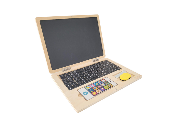 Introducing the Wooden Play Notebook from Kaper Kidz, the perfect educational tool for children who love to learn and play on the go! Designed to look like a real laptop , this wooden notebook is both engaging and interactive, offering a fun and creative way for children to learn and play wherever they are. The notebook features a magnetic chalkboard interior, complete with upper and lowercase magnetic letters that children can use to create words and practice their spelling. The magnetic letters are easy to place and remove, providing a fun and tactile learning experience. This set also comes with 2 picture cards to help children learn numbers and the alphabet. In addition to the magnetic letters, this set comes with a pretend play wooden smart phone and two pieces of dustless chalk , allowing children to play and learn in a variety of ways. The chalkboard wiper makes it easy to erase and start again, making this set perfect for repeated use. Whether your child is at home, in the car, or on the go, this play notebook packs up easily, making it a great educational tool for travel. The compact design means it can be taken anywhere, allowing children to continue their learning and play wherever they are. Each wooden Magnetic notebook from Kaper Kidz is made from timber and finished to the highest quality and painted in child safe, non toxic paint.